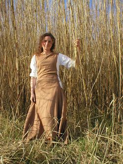 This is a loose robe-like garment which can be knee or ankle length, with a variety of sleeves and necklines, which can be worn belted or loose. It's different from the style above as the waist isn't fitted - a great choice to show off lots and lots of thick and heavy fabric. It has the major advantage that you can just throw it over anything at all underneath and not worry about your under-kit being revealed. However, it really needs to be in fairly heavy cloth to look right, ideally wool, and can get a bit stuffy in hot weather. Team it with a chaperon hat for a really resplendent look!