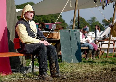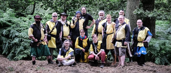 Our referees will be wearing basic costume and a gold and black quartered livery coat like the one pictured. On occasions where we need to put a large number of referees in the field at once then some refs may wear a gold and black quartered tabard instead. Anyone who is wearing a livery coat with this design should be treated as a referee. For this reason players are not allowed to wear this design of livery coat.