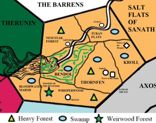 - As of the end of the Autumn Equinox 387YE, the vallorn holds sway in Bendol; Urizen controls Turan Flats, Kroll, Bloodwater Marsh, and Whisperwood; the Druj control Thornfen; and rebels control Nesustak Forest. Sarangrave is an Imperial territory.
