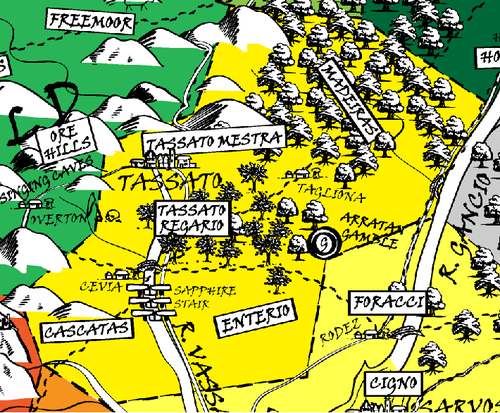The western part of the city is called Tassato Mestra, and the eastern is Tassato Regario. The people on either side of the river are historically rivals, and that historical rivalry occasionally boils up into open conflict. The two cities were unified under the control of Anabela di Regario, a merchant prince who ruled over a century before the creation of the Empire. Anabela was forced to contend with the constant rivalry between the two cities- open battles in the streets between bravos were causing widespread lawlessness and in the end the prince declared a ban on the open carrying of weapons. The ban had the desired effect, damping down the bloodshed although the rivalry was slowly transformed to verbal banter between the two sides. The ban endured until Tassato joined the Empire and in that time the people became famous for their wordplay, launching quips and insults at each other like arrows.