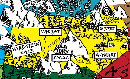 Before the forerunners of the League restored the ruins there, the peak was called Suyan. The mountain dwarfs the surrounding territory, for all that Urizen visitors like to claim (somewhat smugly) that it is not a real mountain. The peaks and foothills of Locul are the site of many prosperous mines, especially those working green iron and weltsilver. One of the best known of these mines is Descent - a mining village built around a large open sinkhole at the foot of Mellfort Peak. Many years ago a stairs and ramp were built spiralling down into the depths of the Descent, and green iron is mined from an extensive cavern complex beneath. The Custodian of the Assayer's Guild often spends a lot of time surveying the mines of Locul, when they are not at their offices in Temeschwar proper.